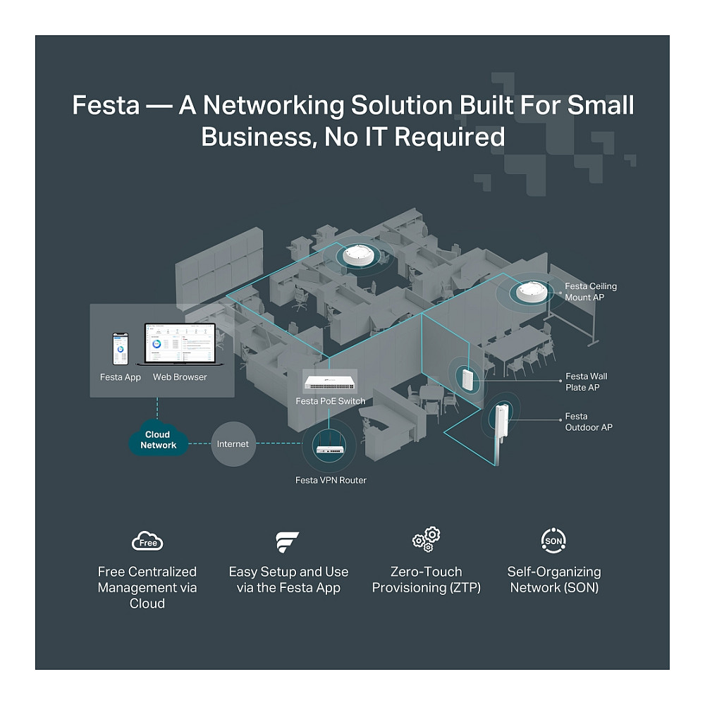 TP-Link FESTA FR365. WAN-Verbindungstyp: RJ-45. WLAN-Band: Dual-band (2.4GHz + 5GHz or 2.4GHz + 6GHz), Top WLAN-Standard: Wi-Fi 6 (802.11ax), WLAN Datentransferrate (max.): 2402 Mbit/s. Schnittstellentyp Ethernet-LAN: Gigabit Ethernet, Netzstandard: IEEE 802.11ac, IEEE 802.11ax, IEEE 802.11n. Unterstützte Sicherheitsalgorithmen: SNMP, SNMPv2, SNMPv3, WPA, WPA2, WPA3. Produkttyp: Tabletop-Router, Produktfarbe: Weiß