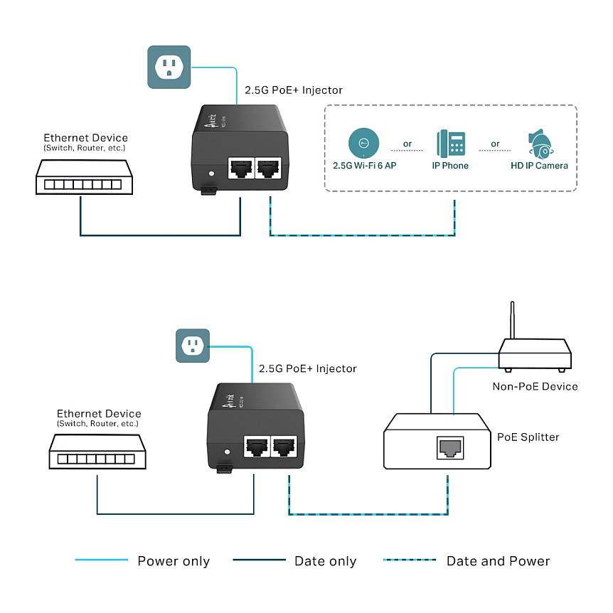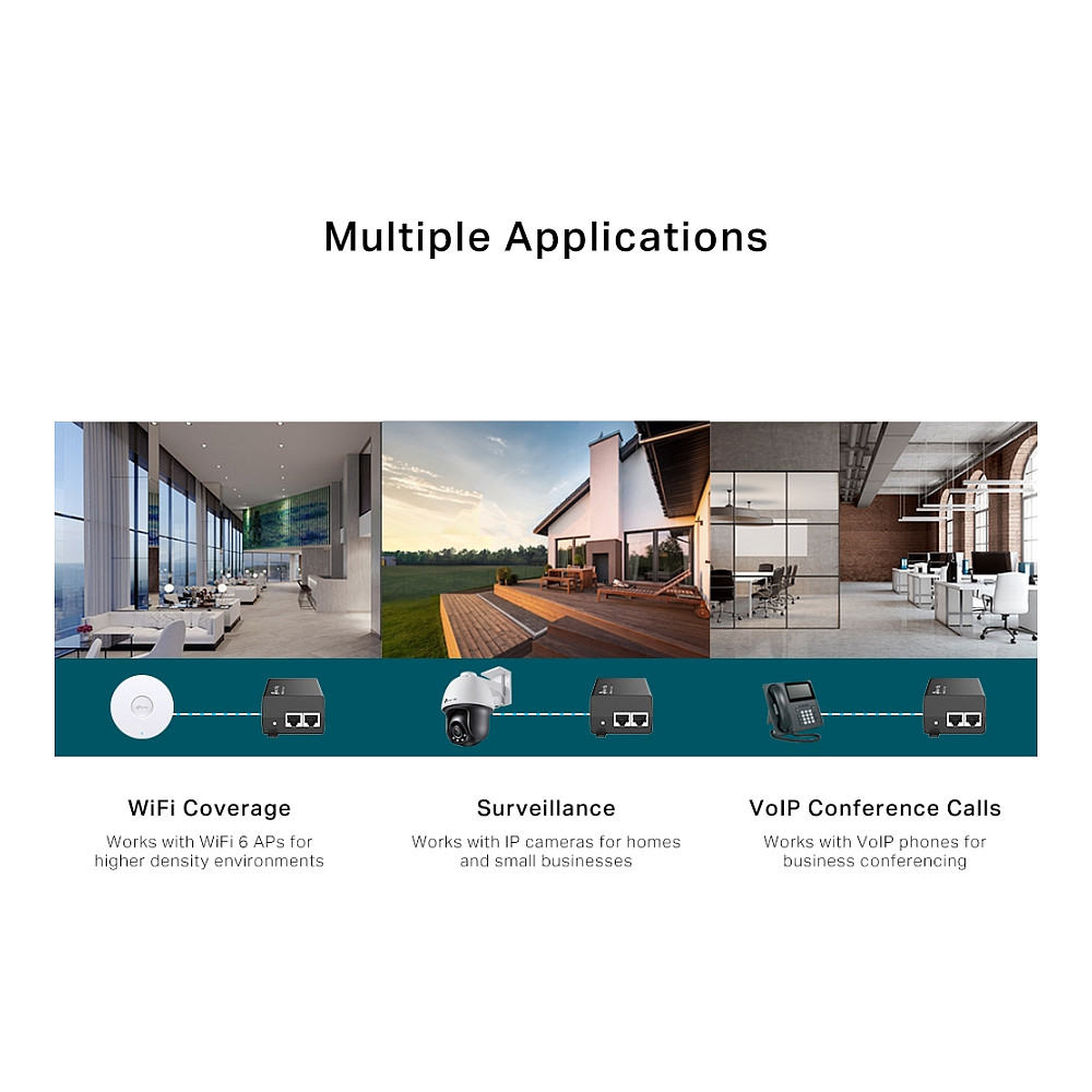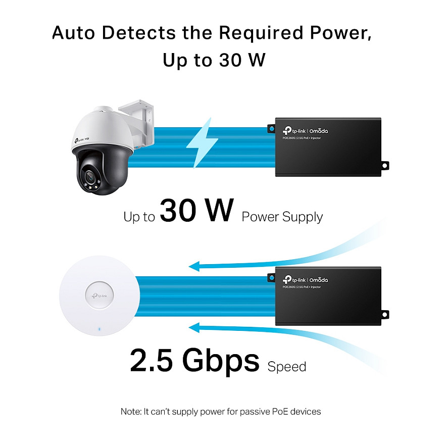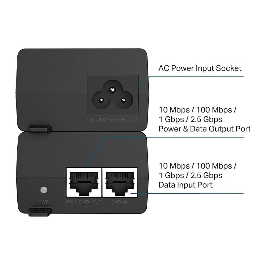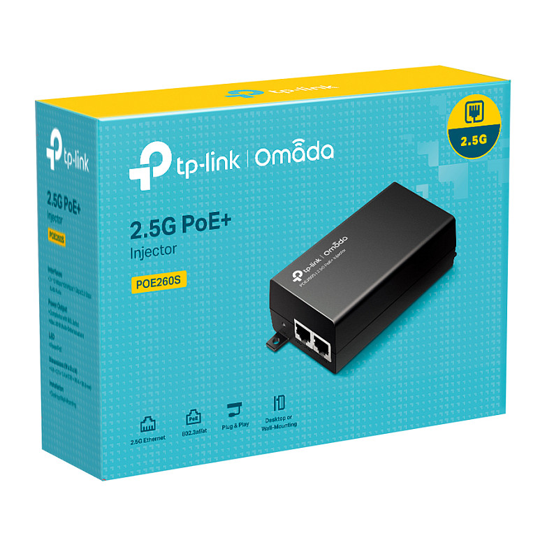 TP-Link Omada POE260S. Ethernet Schnittstellen Typ: 2.5 Gigabit Ethernet, Schnelles Ethernet, Gigabit Ethernet, Ethernet LAN Datentransferraten: 10,100,1000,2500 Mbit/s, Netzstandard: IEEE 802.3ab, IEEE 802.3af, IEEE 802.3at, IEEE 802.3bz, IEEE 802.3i, IEEE 802.3u. Produktfarbe: Schwarz, Maximaler Arbeitsabstand: 100 m. Ausgangsleistung: 30 W, Netzteil Eingansgsspannung: 100 - 240 V, Netzteilfrequenz: 50/60 Hz. Zertifizierung: FCC, CE, RoHS. Breite: 125 mm, Tiefe: 59,4 mm, Höhe: 36,8 mm
