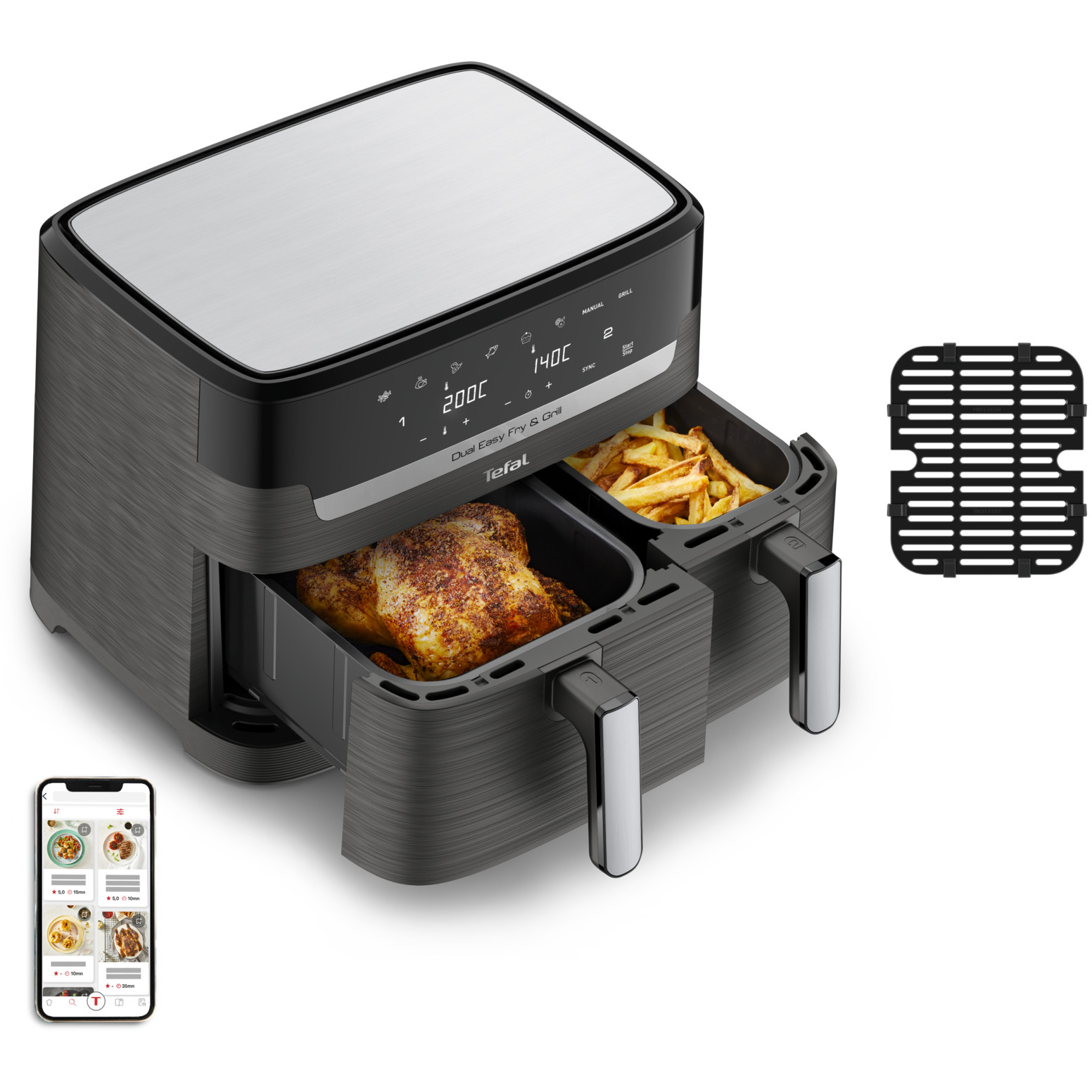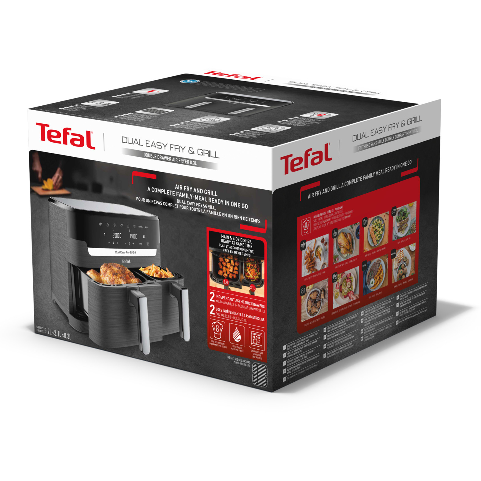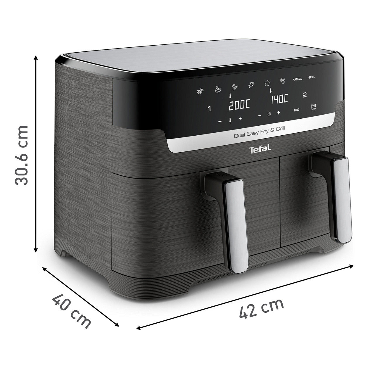Tefal Dual Easy Fry & Grill EY905B. Produkttyp: Heißluftfritteuse, Fassungsvermögen: 8,3 l. Bauart: Doppel, Produktfarbe: Grau, Steuerung: Berührung. Display-Typ: LCD. Leistung: 2700 W. Breite: 402 mm, Tiefe: 418 mm, Höhe: 305 mm