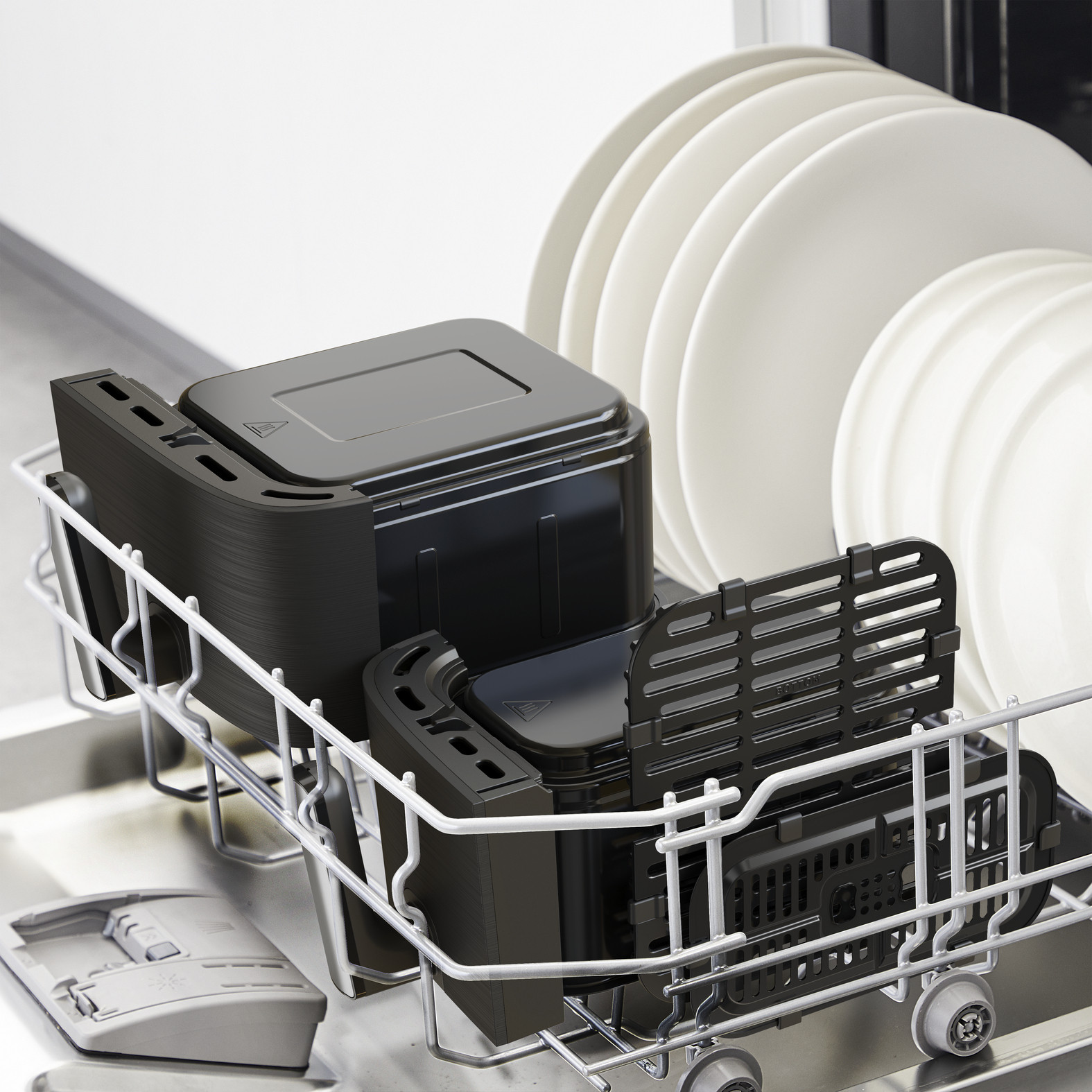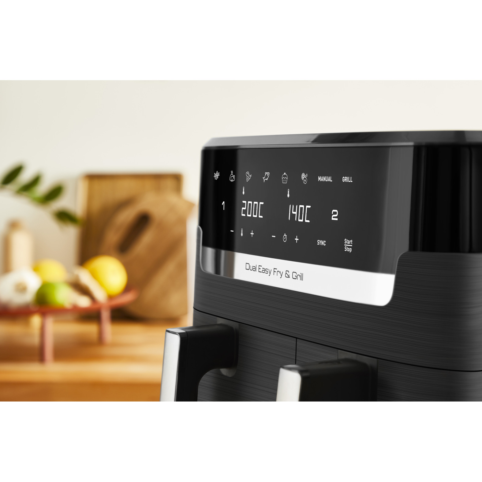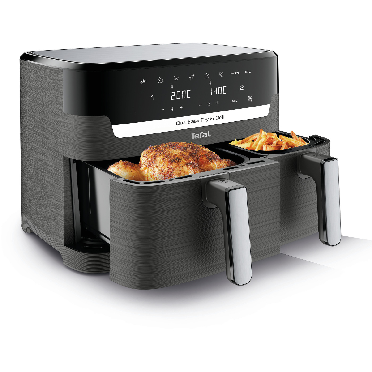 Tefal Dual Easy Fry & Grill EY905B. Produkttyp: Heißluftfritteuse, Fassungsvermögen: 8,3 l. Bauart: Doppel, Produktfarbe: Grau, Steuerung: Berührung. Display-Typ: LCD. Leistung: 2700 W. Breite: 402 mm, Tiefe: 418 mm, Höhe: 305 mm