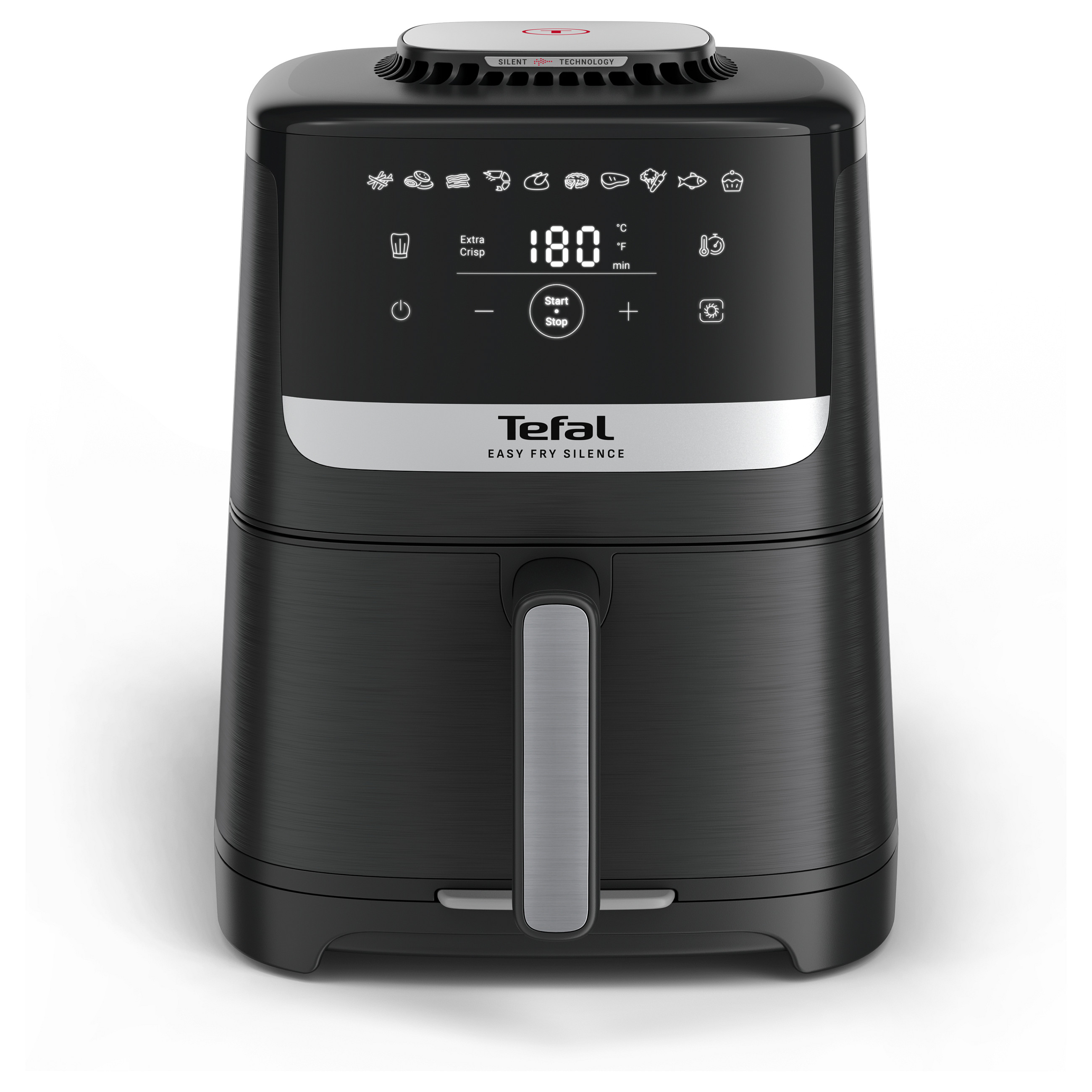 Tefal Easy Fry Silence EY5528E0. Produkttyp: Heißluftfritteuse, Fassungsvermögen: 5 l, Temperatur (min): 40 °C. Bauart: Einzelbild, Produktfarbe: Schwarz, Edelstahl, Steuerung: Berührung. Display-Typ: LCD. Stromstecker-Typ: Typ C. Breite: 280 mm, Tiefe: 350 mm, Höhe: 395 mm