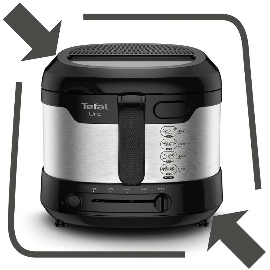 Sparen Sie Platz in der Küche und kochen Sie trotzdem für die ganze Familie! Die Tefal Uno M Fritteuse ist kompakt und bietet zugleich ein großes Fassungsvermögen für Ihre Lieben! Die großzügige Kapazität von 1 kg reicht leicht für vier Personen, während sie sich dank ihrer kompakten Abmessungen und des einklappbaren Griffs auf der Arbeitsfläche und im Schrank jeder Küche leicht unterbringen lässt. Neben praktischen Merkmalen, wie einem großen Sichtfenster zur leichten Überwachung und einem automatischen Deckelöffner, verfügt die Uno M darüber hinaus über einen einstellbaren Thermostat (150 °C bis 190 °C), der große Vielfalt beim Zubereiten aller möglichen Speisen bietet.