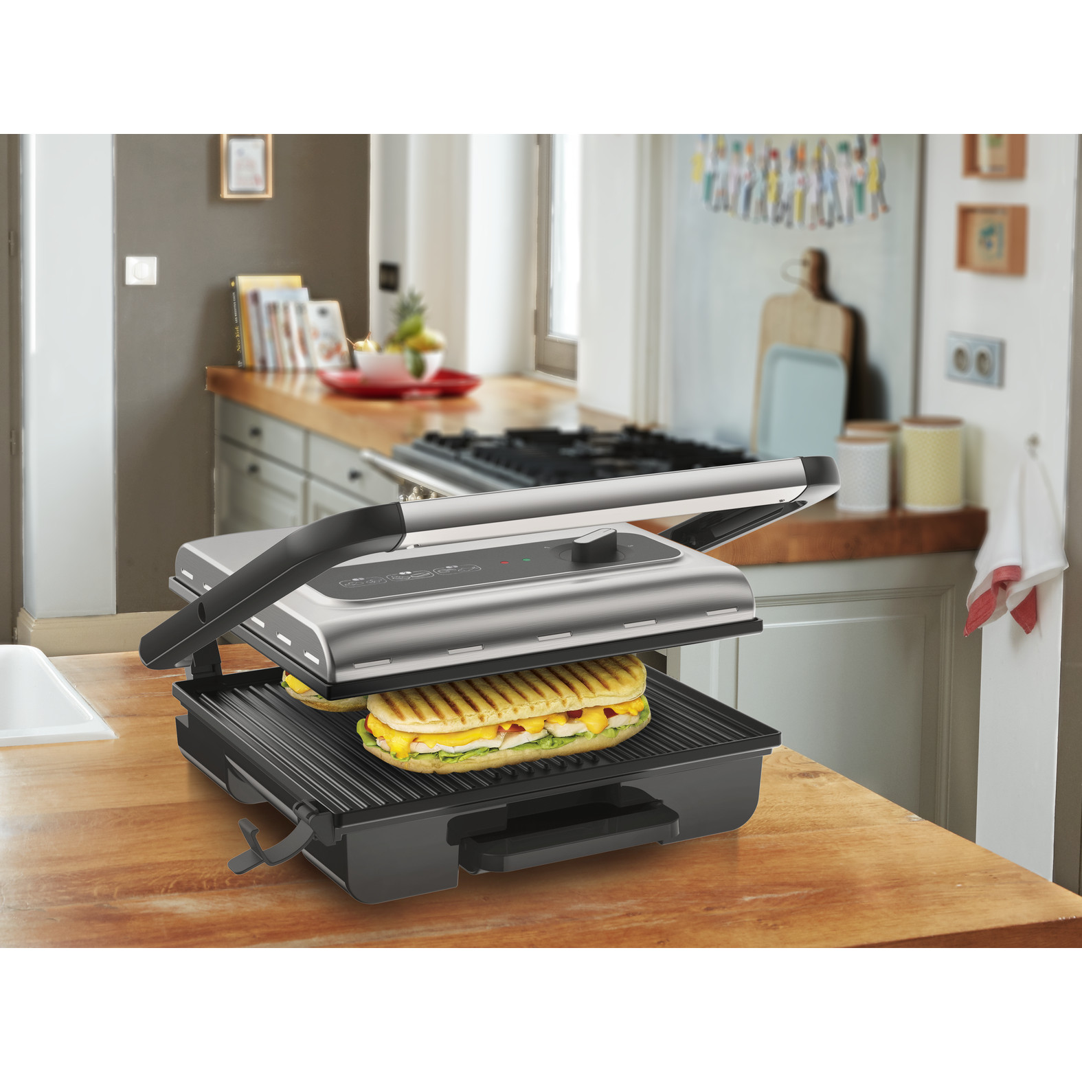 Mit diesem leistungsstarken Kontaktgrill für Fleisch, und Panini und vieles mehr zaubern Sie perfekt gegrilte oder köstlich getoastete Speisen. Genießen Sie gesunde Grill-Gerichte, denn dank der Antihaftbeschichtung ist kein zusätzliches Öl zum Grillen nötig, und überschüssiges Fett läuft direkt in die Saftauffangschale ab. Der regelbare Thermostat lässt sich auf 3 Stufen einstellen, damit Ihnen alles ideal gelingt. Mit den leistungsstarken 2000 W und den antihaftbeschichteten Grillplatten wird erst das Grillen und dann auch das Reinigen zum Kinderspiel. Und dank der Möglichkeit zur vertikalen Aufbewahrung ist auch das Verstauen kein Problem.