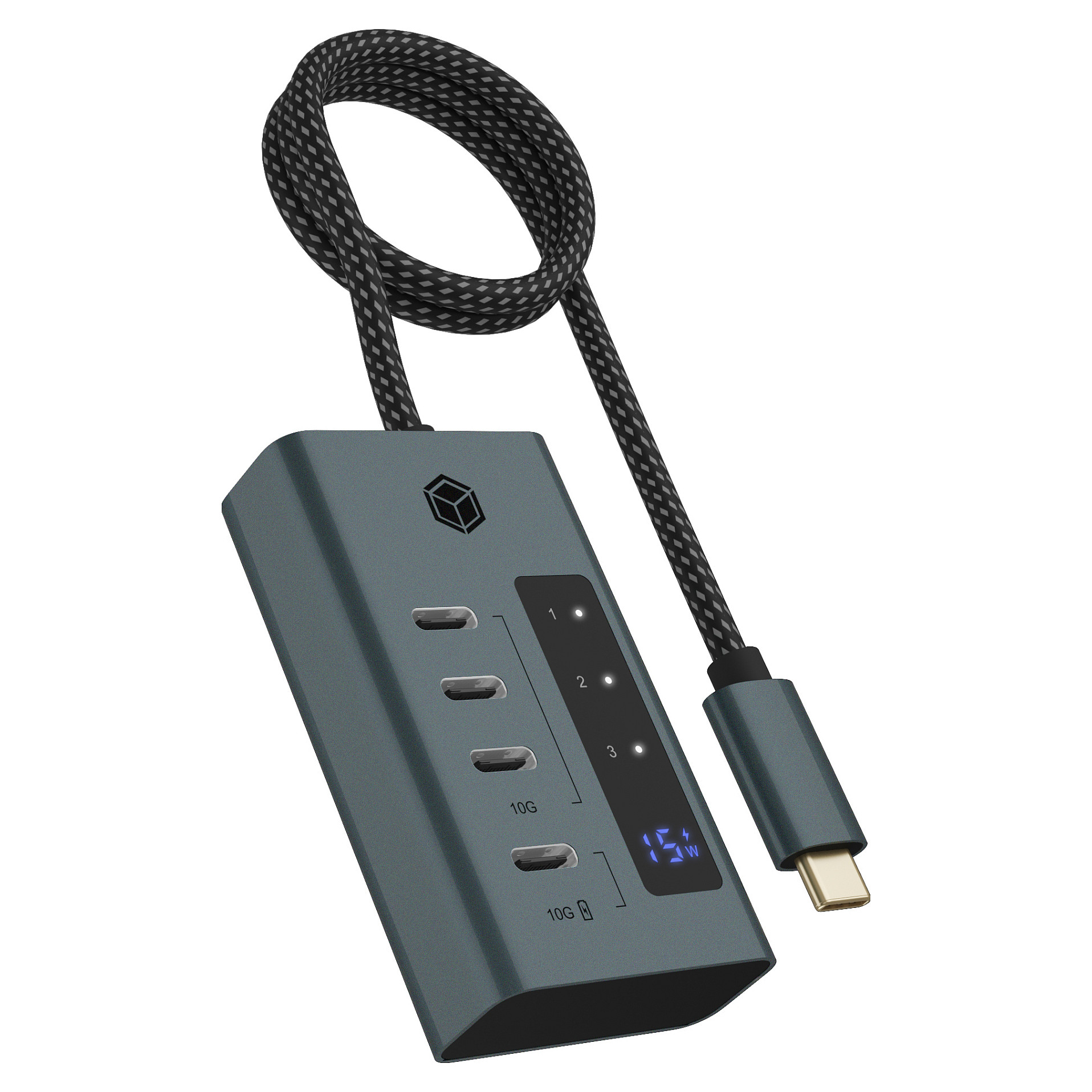 Der Hub erweitert einen USB-C Anschluss des Hosts auf 4 USB Type-C® 3.2 Gen 2 Anschlüsse, die dem Nutzer eine Datenübertragungsrate von bis zu 10 Gbit bieten. Zusätzlich bietet einer der Ports eine Lade- funktion mit bis zu 20 Watt für ein angeschlossenes Endgerät.