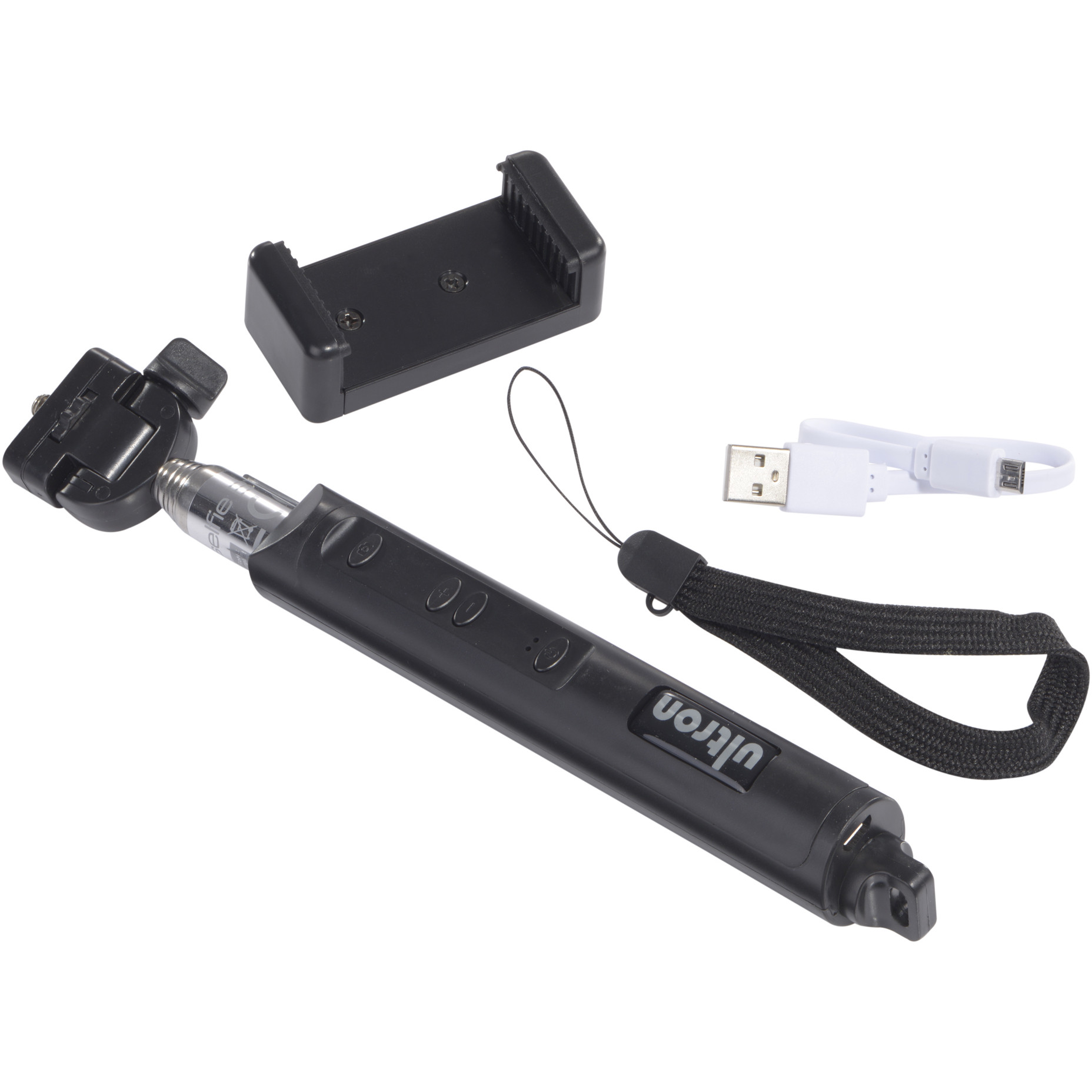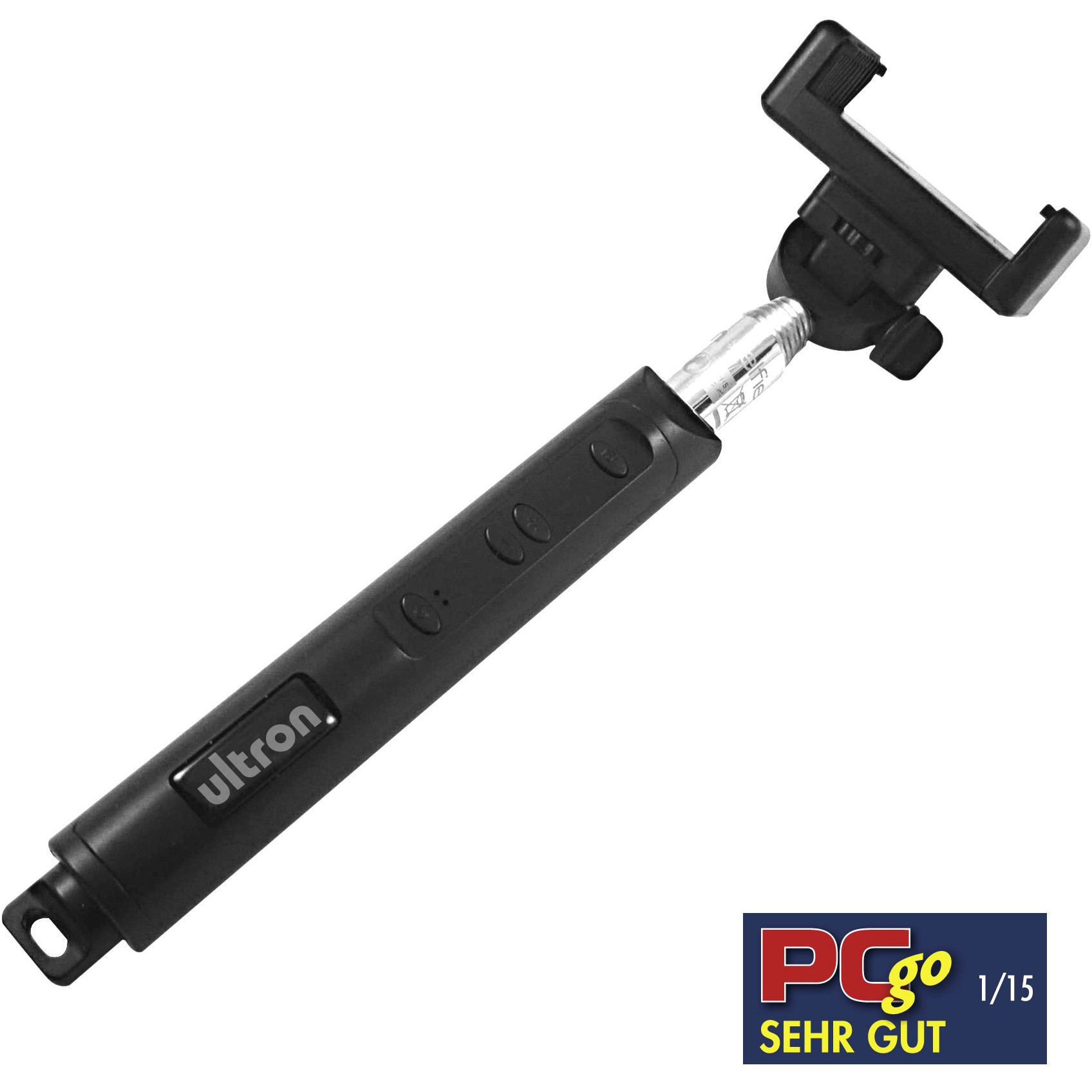 Der verlängerte Arm kommuniziert via Bluetooth 3.0 und lässt sich in sieben Stufen bis zu 1,1 Meter ausziehen. An der Oberseite befindet sich ein 0,6 cm Universalgewinde (1/4") für Actionscams und Digitalkameras, ebenso werden zwei verschiedene Halterungen für Smartphones mitgeliefert. Dort werden die entsprechenden Geräte befestigt. Am Griff befinden sich, neben den Buttons zum Zoomen, der Knopf zum Auslösen sowie der Ein- und Ausschalter. Der 100 mAh Akku wird über USB geladen.