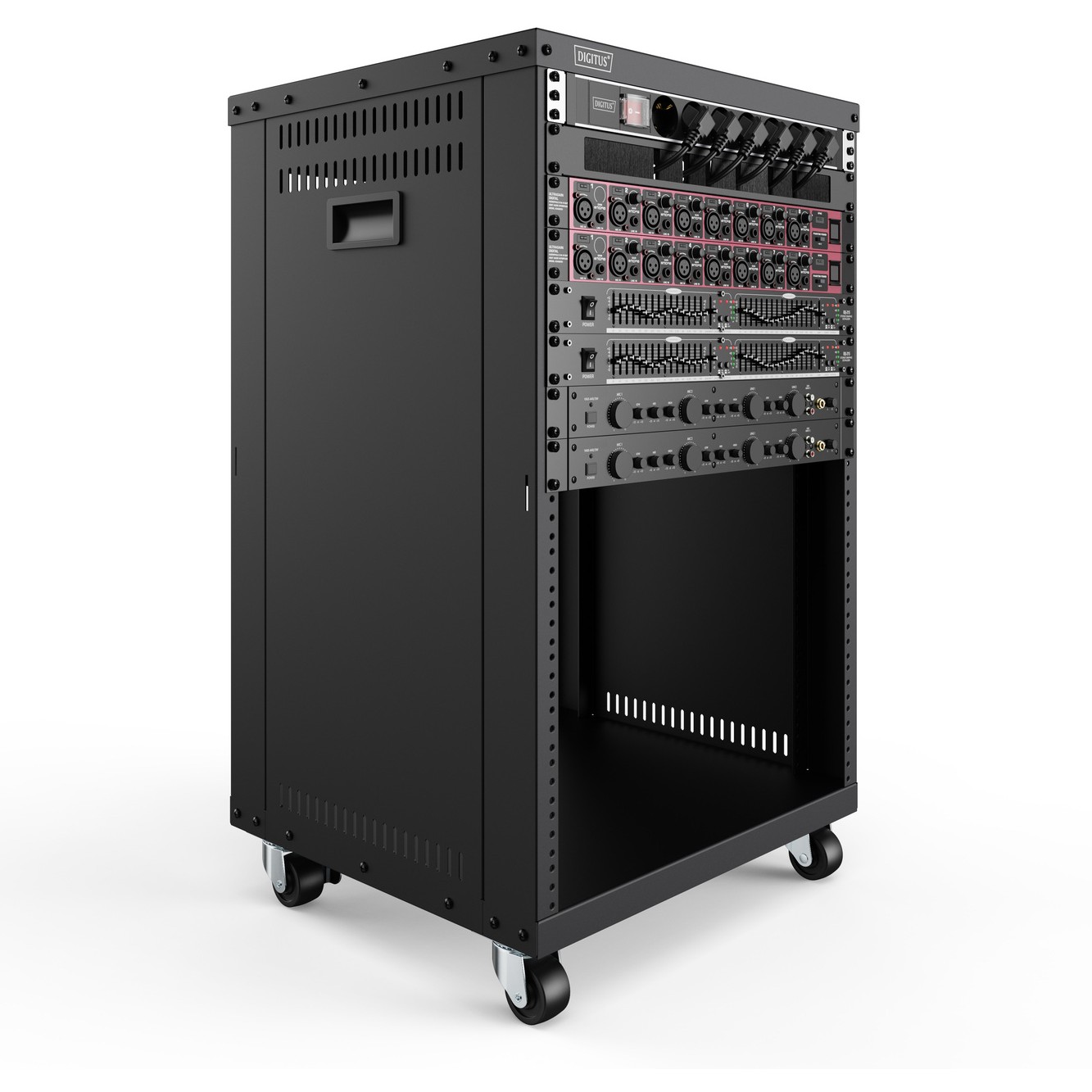 Die 19-Zoll Racks von DIGITUS® sind dank ihrer Gewindelochung universell einsetzbar. Audio Video Zubehör (AVS) oder aktive- und passive Netzwerkkomponenten können im Handumdrehen, ohne den Bedarf von Käfigmuttern, montiert werden. Die Gewindelochung der Profile erlaubt die Kompatibilität mit U.S.- oder EU Schraubengrößen. Beide Schraubentypen sind im Lieferumfang enthalten. Eine beanspruchbare Stahblechkonstruktion sorgt für die notwendige Robustheit und erlaubt Traglasten von bis zu 136 kg. Lüftungsschlitze an beiden Seitenwänden sorgen für eine passive Kühlung der zu verbauenden Komponenten. Ausgestattet mit Rollen sowie Tragegriffen, sind die 19-Zoll Racks bei Bedarf beweglich und somit optimal positionierbar. Die Lieferung erfolgt als unmontiertes Flatpack um den Logistikaufwand zu optimieren. Der Aufbau des Racks ist dank des beiligenden Schraubendrehers sowie der einfachen Konstruktion schnell und einfach zu erledigen. Das Portfolio umfasst verschiedene Größen um jeder Anforderung gerecht zu werden.
