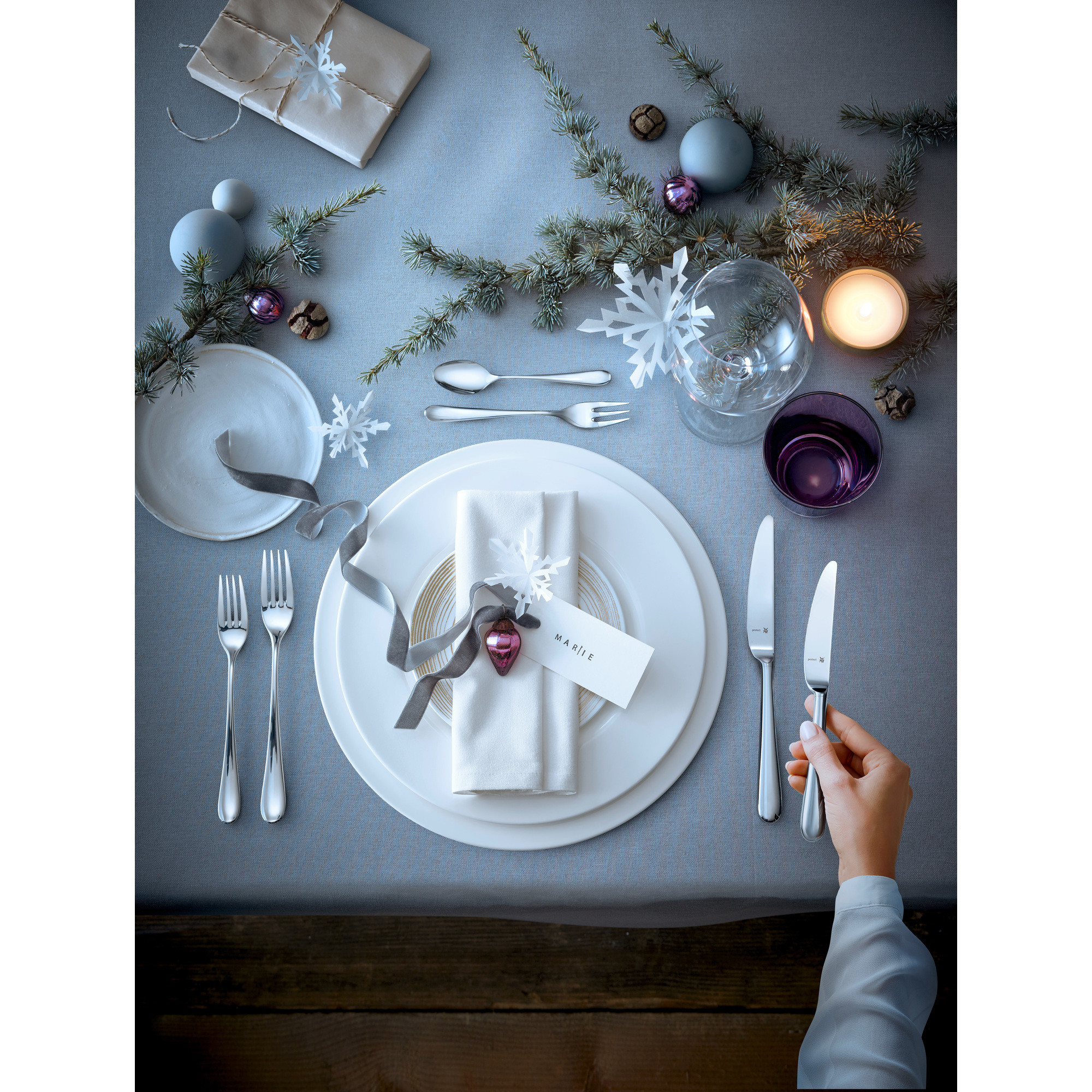 Ganz klar: Dieses Set ist für die große Tafel gedacht. Es bietet Besteck für zwölf Personen – Menuegabel, -messer und -löffel sowie Kuchengabel und Kaffeelöffel – und darüber hinaus nützliches Zubehör. Dazu gehören ein zweiteiliges Salatbesteck, ein Servierlöffel und eine Serviergabel, ein Portionsschöpfer sowie ein Tortenheber. Natürlich ist das Set in verschiedenen WMF Designs erhältlich, kann mit passenden Ergänzungsteilen erweitert werden und wird Ihnen dank seiner Hochwertigkeit ein gleichermaßen schöner wie dauerhafter Begleiter sein.