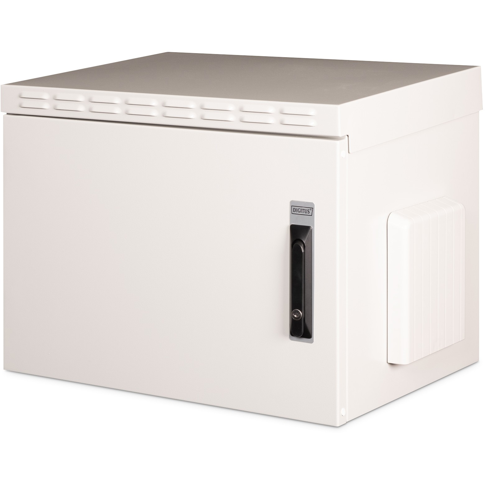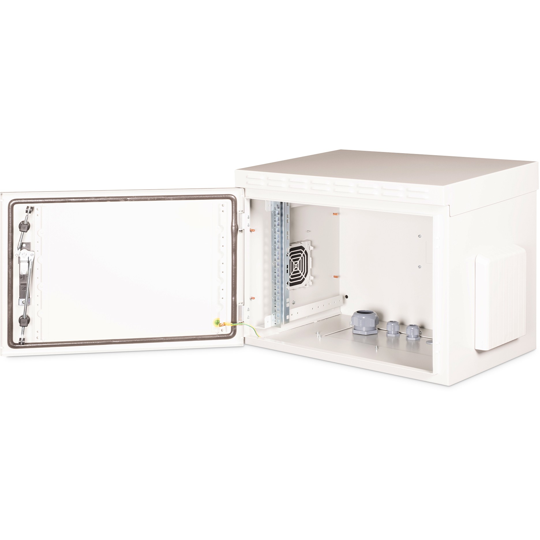 Die Industrie-Netzwerkschränke zur Wandmontage sind gemäß Schutzart IP55 speziell an die Bedürfnisse von rauen Umgebungen, besonders im Außenbereich, angepasst. Beste Leistung bieten die Wandgehäuse unter anderem durch das 3-Punkt-Verriegelungssystem mit abschließbarem Schwenkgriff und isolierten PG-Kabelverschraubungen. Integrierte Lüftungsfiltergehäuse sorgen für Frischlufteinlass (Schutz vor Wasser- und Staubeindringung gem. IP54). Anwendungsgebiete sind bspw. Außenbereiche, die den Umwelteffekten ausgesetzt sind (Regen, Staub, Hagel, Schnee, Spritzwasser). Für die Aufnahme eines Lüftermoduls wird das Dachchassis ebenfalls mit einem gefilterten Bereich versehen. Ein Paar galvanisierte, mit in beide Richtungen ablesbare Höheneinheiten beschriftete 483 mm (19")-Profilschienen sind im Inneren verbaut. Diese lassen sich in der Tiefe verstellen. Jeder Schrank ist eine robuste Stahlkonstruktion aus bis zu 2,0 mm starkem Stahlblech. Die Farbgebung erfolgt in Form von elektrostatischer Pulverbeschichtung in der Standardfarbe Grau (RAL 7035). Die Wandmontage erfolgt mittels beigelegter Haltewinkel. Optional lassen sich die Schränke mit einem Sockel als freistehende Lösung verwenden oder mittels Befestigungsset an Masten befestigen.