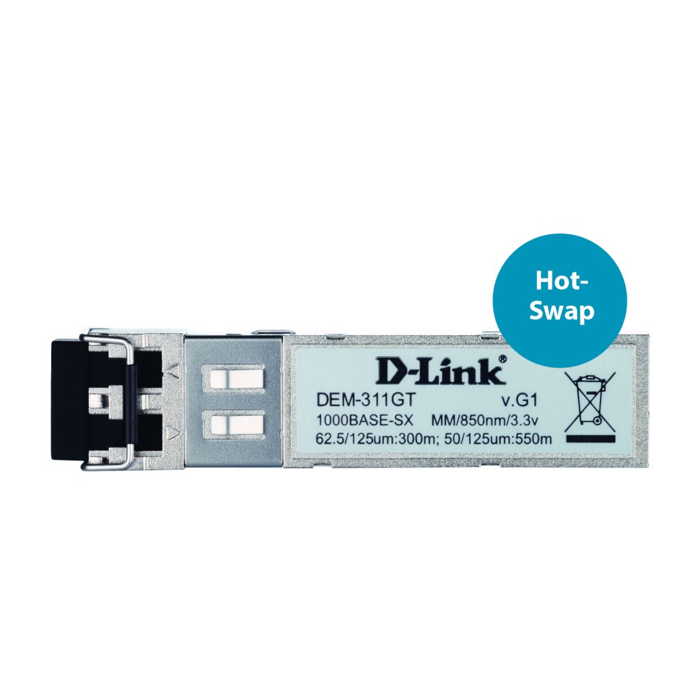 D-Link DEM-311GT. SFP Transceiver-Typ: Faseroptik, Maximale Datenübertragungsrate: 1000 Mbit/s, Schnittstelle: SFP. Produktfarbe: Metallisch, Gehäusematerial: Metall. Maximale Spannung: 6 V. Zertifizierung: MSA, RoHS. Breite: 13,8 mm, Tiefe: 57,2 mm, Höhe: 8,5 mm