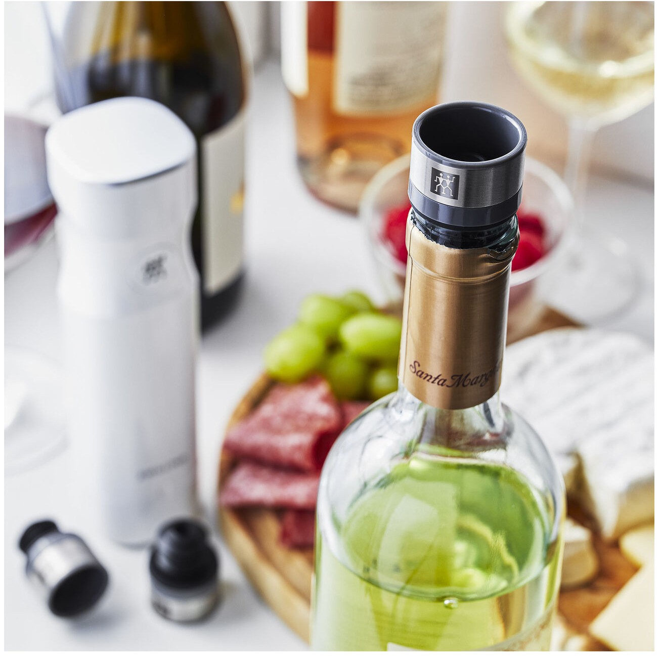Das Leben ist zu kurz für schlechten Wein! Was schätzt du: Wie lange ist Wein in einer angebrochenen Flasche haltbar? Einmal geöffnet, startet der Oxidationsprozess, der vor allen Dingen bei Rotwein zunächst ausdrücklich erwünscht ist. Der Wein soll „atmen“, damit sein Bouquet und seine Aromen freigesetzt werden. Zu langer Kontakt mit Luft führt aber dazu, dass Wein innerhalb kurzer Zeit seine Frische und sein Bouquet verliert. Der Effekt: Der Wein schmeckt flach und muss häufig bereits nach zwei bis drei Tagen weggeschüttet werden. Damit ist jetzt Schluss! Der FRESH & SAVE Vakuum-Weinverschluss verlangsamt dank seiner innovativen Dichtung zuverlässig diesen Prozess. Setze den Design-Verschluss auf den Flaschenhals, und auf Knopfdruck entzieht die leistungsstarke und handliche Vakuumpumpe der Weinflasche automatisch die Luft. Aromen und Frische werden zuverlässig versiegelt. So verschlossen halten deine Weine im Kühlschrank länger frisch! Das Handling der kabellosen Pumpe und des Vakuum-Weinstoppers ist unkompliziert und schnell – Entkorken in rückwärts. Der hochwertig designte Vakuum Weinverschluss eignet sich übrigens nicht nur für Weinflaschen: Auch Öle oder Säfte bewahren Aromen und Vitamine im Vakuum viel länger. Lediglich kohlensäurehaltige Getränke eignen sich nicht für die Lagerung unter Vakuum. Ummantelt mit rostfreiem Edelstahl, ist der hochwertige Weinstopper spülmaschinengeeignet und somit ganz bequem zu reinigen.