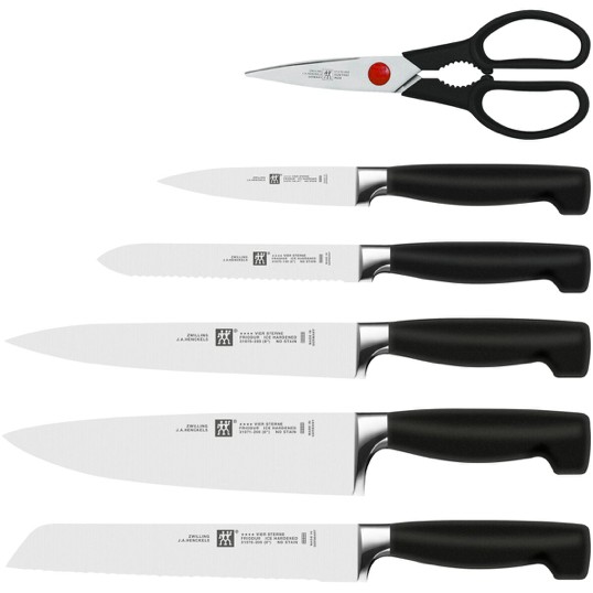 Enthält 1 Spick- und Garniermesser (10 cm), 1 Universalmesser (13 cm), 1 Fleischmesser (20 cm), 1 Kochmesser (20 cm), 1 Brotmesser (20 cm), 1 Vielzweckschere, 1 Block