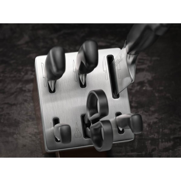 Scharfe Messer sind sichere Messer: Sie brauchen bei der Verwendung weniger Kraft und rutschen nicht ab. Und um die optimale Schärfe Ihrer Messer kümmert sich in Zukunft der ZWILLING SharpBlock mit KIS Technologie aus der Serie VIER STERNE®. Der selbstschärfende Messerblock schützt Ihre Messer vor Beschädigung und nimmt Ihnen das Schleifen von Hand komplett ab. Sie müssen sich also keine Gedanken darüber machen, wann der richtige Zeitpunkt zum Nachschärfen Ihrer Messer ist und wie Sie richtig schärfen. Das Geheimnis des Blocks befindet sich in den Einsteckfächern: In die Fächer der Messer mit glatter Schneide (Spick- und Garniermesser, Fleisch- und Kochmesser) wurden zwei Schleifsteine aus Keramik integriert, die im idealen Schleifwinkel angeordnet sind. Jedes Mal, wenn Sie ein Messer herausziehen oder wieder hineinstecken, wird die Schneide so automatisch aufgerichtet und die Messer sind jederzeit scharf und einsatzbereit – ganz ohne Kraftaufwand. Für eine optimale Übersicht zeigen einfache Piktogramme, welches Fach für welche Klingenform geeignet ist. Der 7-teilige Messerblock sorgt nicht nur für besondere Langlebigkeit Ihrer Messer, er ist auch ein optisches Highlight in Ihrer Küche. Der Block im zeitlosen weisston ist für besondere Widerstandsfähigkeit mit einer Edelstahlabdeckung versehen. Der ZWILLING SharpBlock ist mit Messern der Serie VIER STERNE® ausgestattet, die seit über 40 Jahren durch ihre Form, Qualität und Funktionalität überzeugen. Enthalten sind ein Spick- und Garniermesser (Klingenlänge 10 cm), ein Fleischmesser (20 cm), ein Kochmesser (20 cm), ein Universalmesser (13 cm), ein Brotmesser (20 cm) aus der Serie VIER STERNE® und eine Vielzweckschere aus der Serie TWIN L.