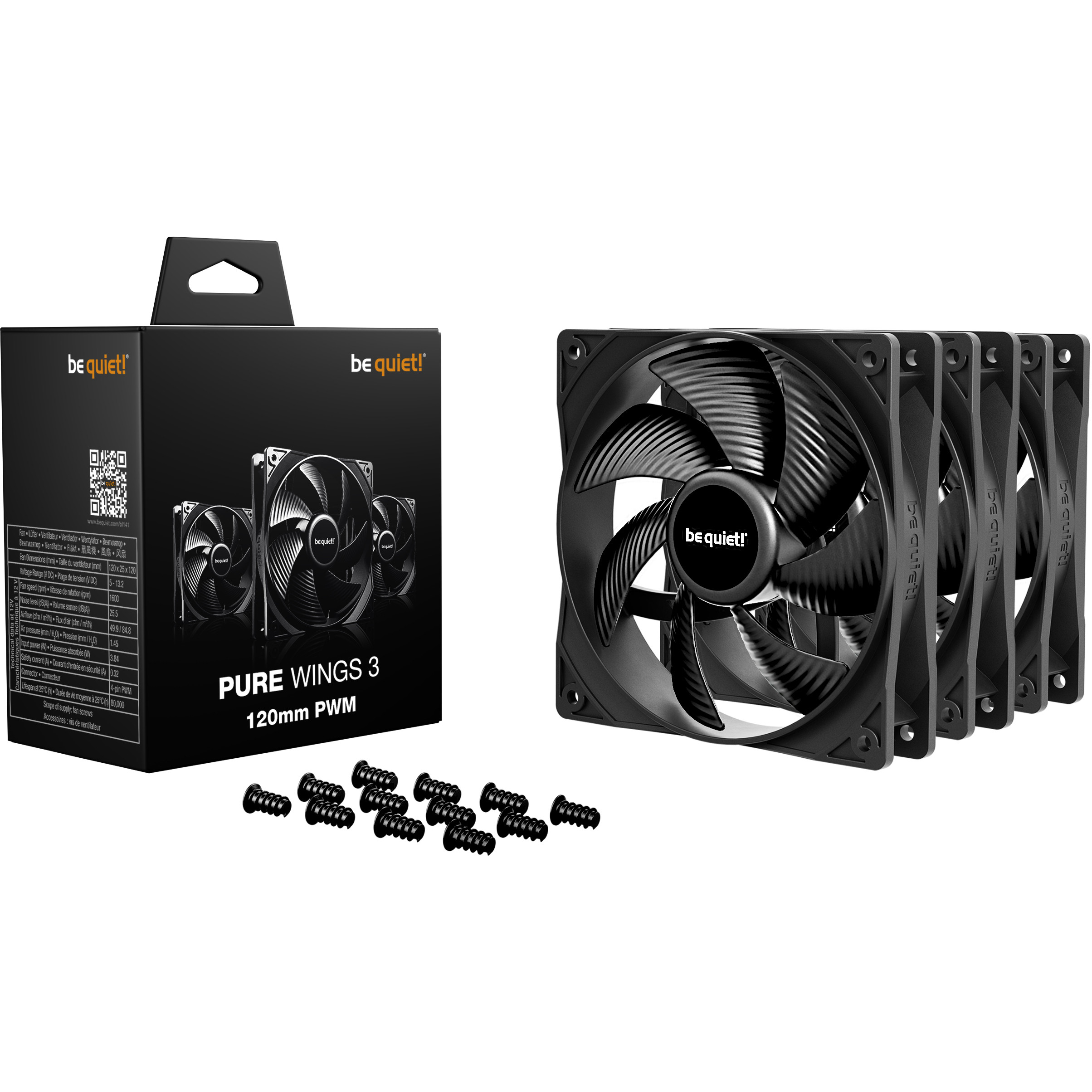 be quiet! Pure Wings 3 120 mm PWM Triple Pack. Typ: Ventilator, Lüfterdurchmesser: 12 cm, Rotationsgeschwindigkeit (max.): 1600 RPM, Luftstrom: 84,8 m³/h, Maximum Luftdruck: 1,45 mmH2O, Lagertyp: Gewehrlager. Spannung: 5 - 13.2 V. Produktfarbe: Schwarz