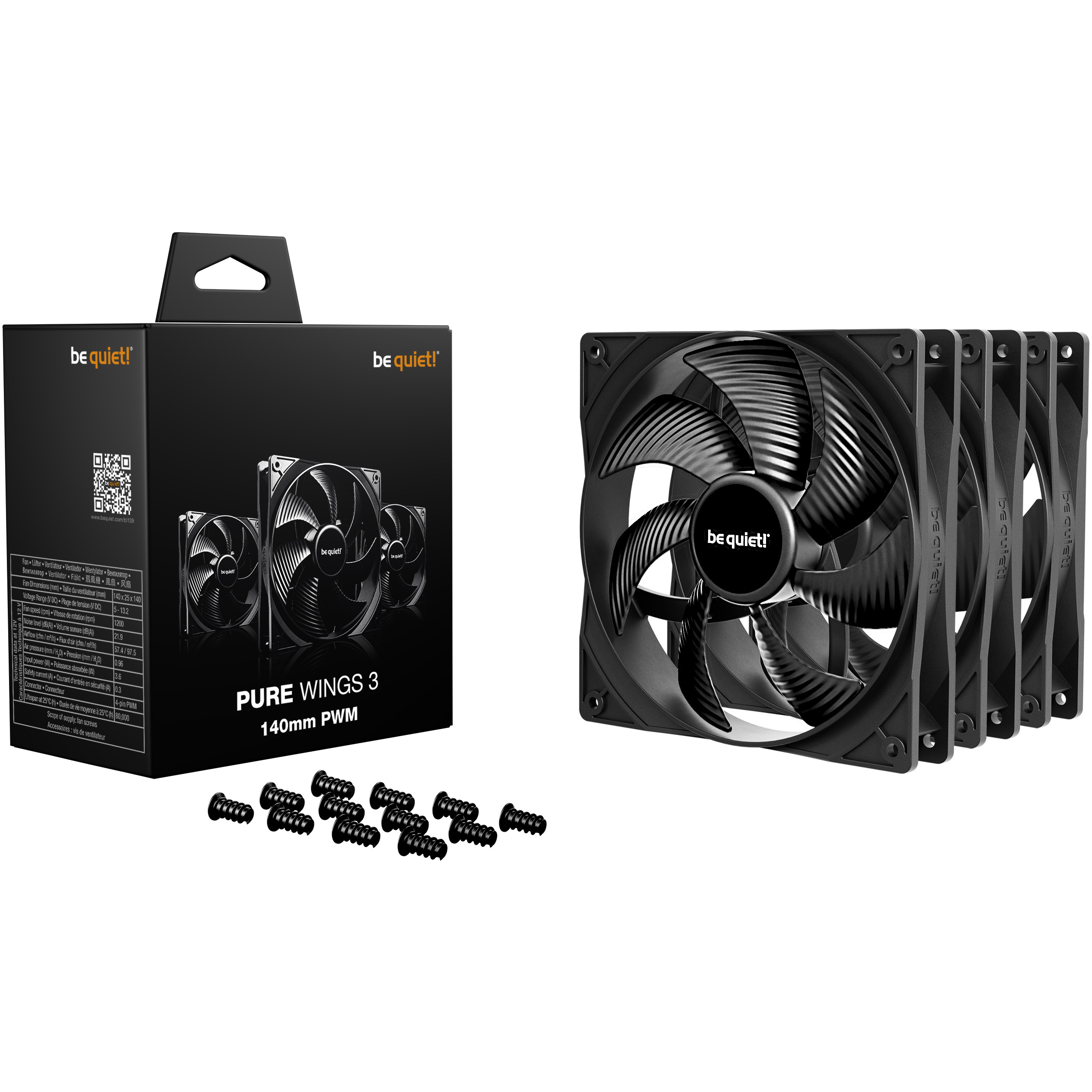 be quiet! Pure Wings 3 140 mm PWM Triple Pack. Typ: Ventilator, Lüfterdurchmesser: 14 cm, Rotationsgeschwindigkeit (max.): 1200 RPM, Luftstrom: 97,5 m³/h, Maximum Luftdruck: 0,96 mmH2O, Lagertyp: Gewehrlager. Spannung: 5 - 13.2 V. Produktfarbe: Schwarz