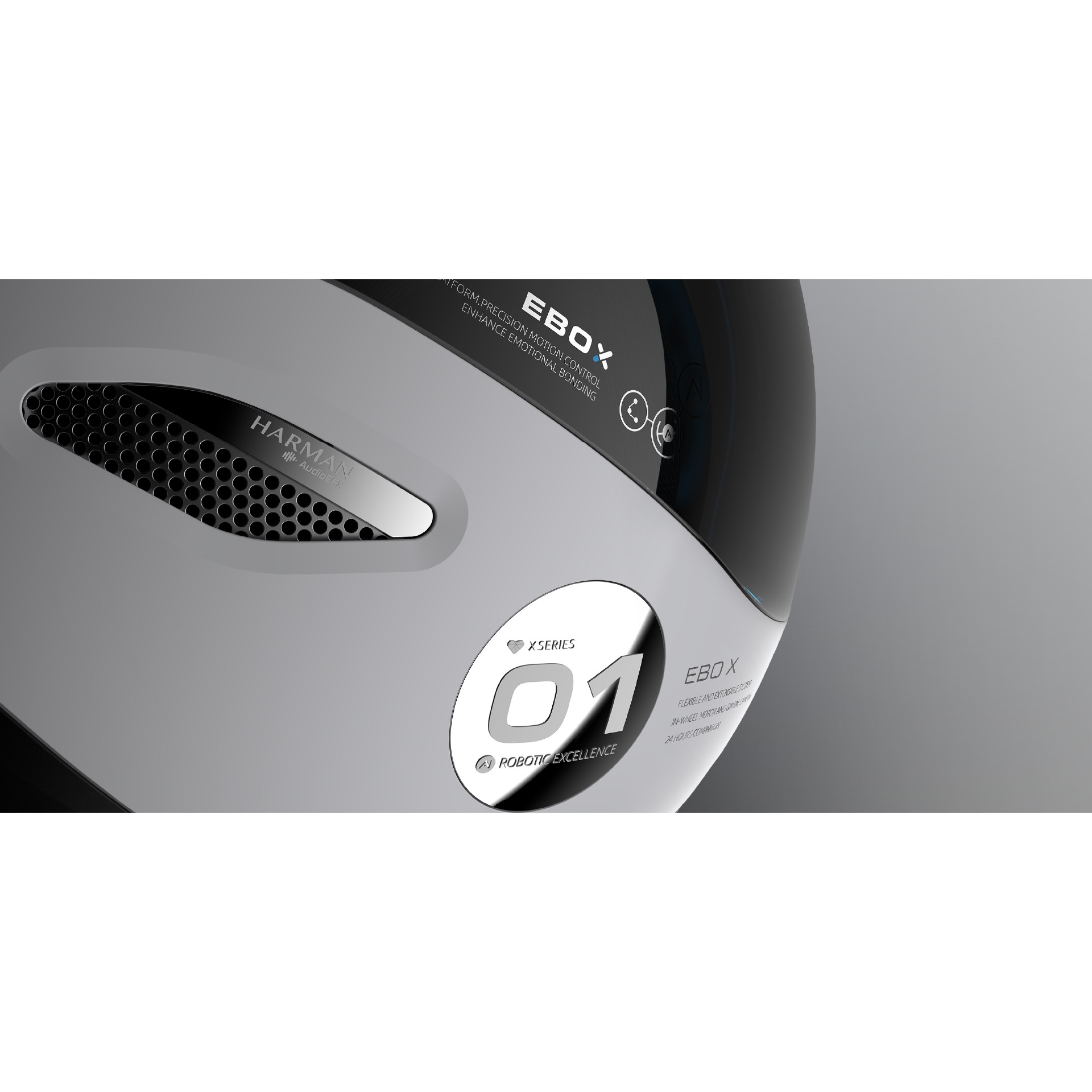 EBO X kann auf drei Arten gesteuert werden: durch Sprachbefehle, über die EBO HOME App und durch Berühren der silbernen Zonen an den Seiten. Diese Steuerelemente ermöglichen ein interaktives und immersives Erlebnis, eine präzise Mobilitätssteuerung und die Anpassung verschiedener Funktionen.