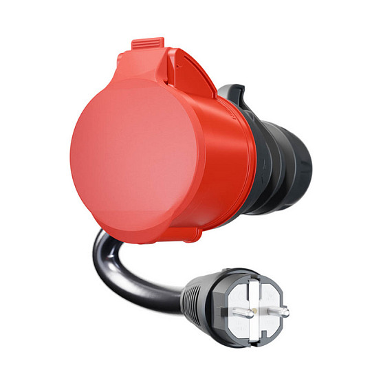 Adapterkabel für den go-e Charger Gemini flex 22 kW mit 32 A CEE rot Stecker (dreiphasig - Drehstrom). Der Adapter ermöglicht den Anschluss an Haushaltssteckdosen. Die eingebaute Adaptererkennung sorgt, in Verbindung mit dem go-e Charger Gemini flex 22 kW, für eine automatische Reduzierung des Ladestroms auf 16 A.