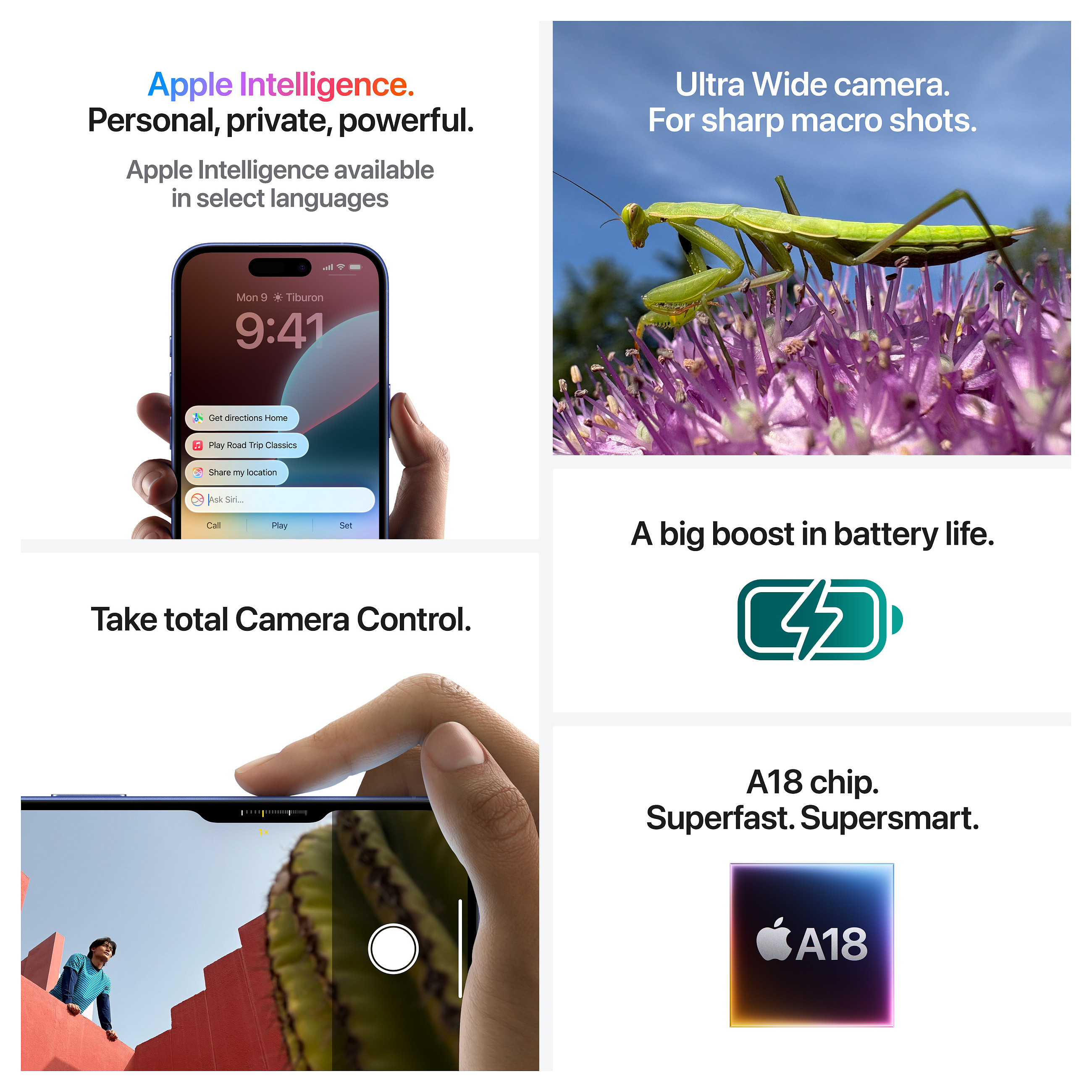 Apple iPhone 16 . Bildschirmdiagonale: 15,5 cm (6.1"), Display-Auflösung: 2556 x 1179 Pixel. Prozessorfamilie: Apple, Prozessor: A18. Interne Speicherkapazität: 128 GB. Auflösung Rückkamera (numerisch): 48 MP, Rückkamera-Typ: Dual-Kamera. SIM-Kartensteckplätze: Dual-SIM. Installiertes Betriebssystem: iOS 18. Produktfarbe: Schwarz. Gewicht: 170 g