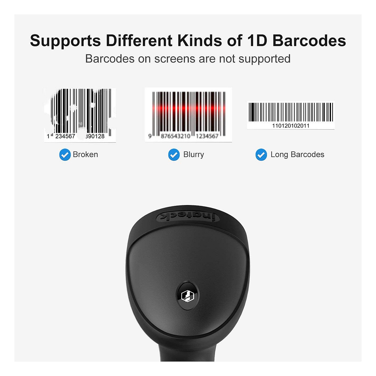 Lineare (1D) Barcodes unterstützt: Codabar, Code 11, Code 128, Code 39 (ASCII), Code 93, EAN-13, EAN-8, GS1-128 (UCC/EAN-128), ISBN, ISSN, Industrial 25, MSI, Standard 25, UPC-A, UPC-E
