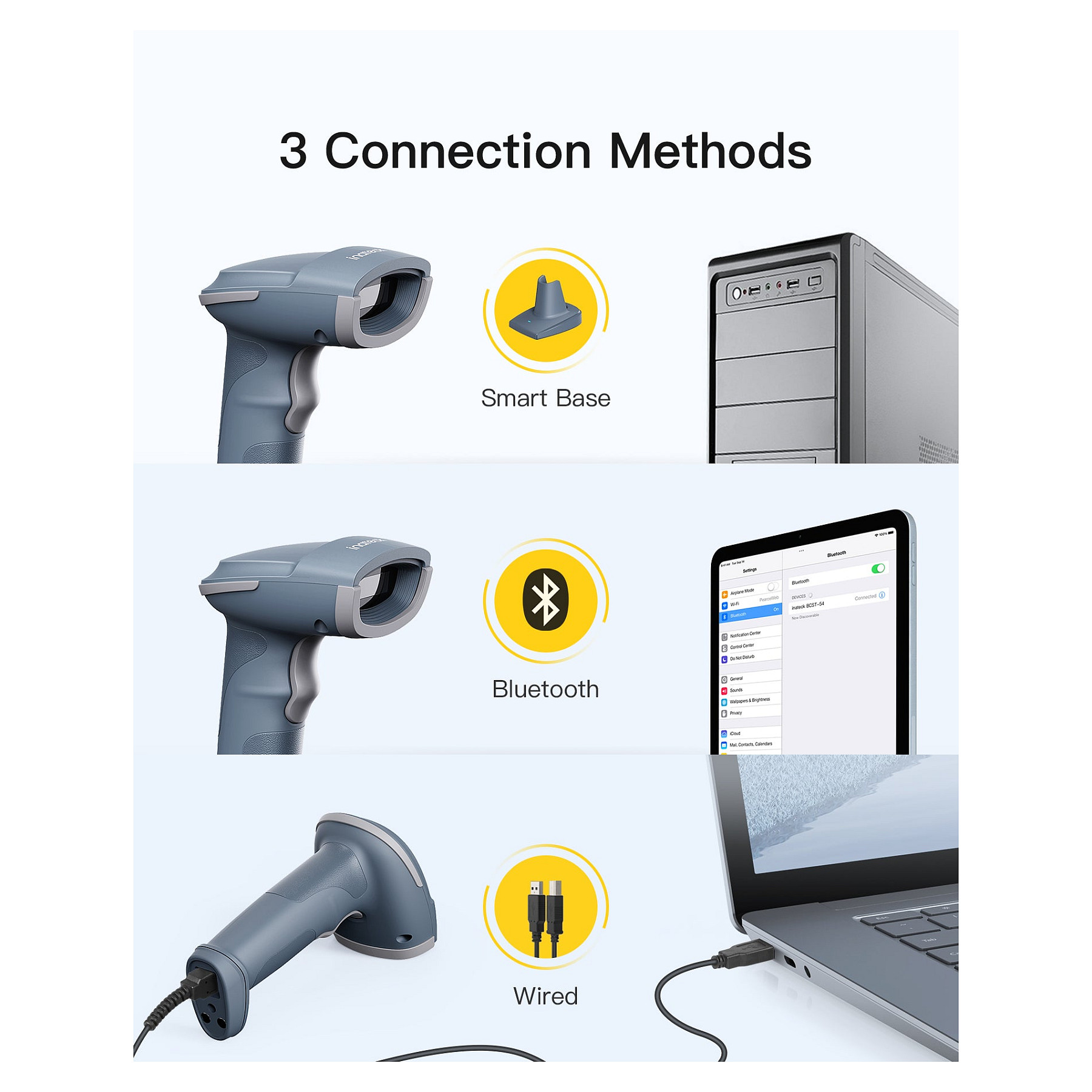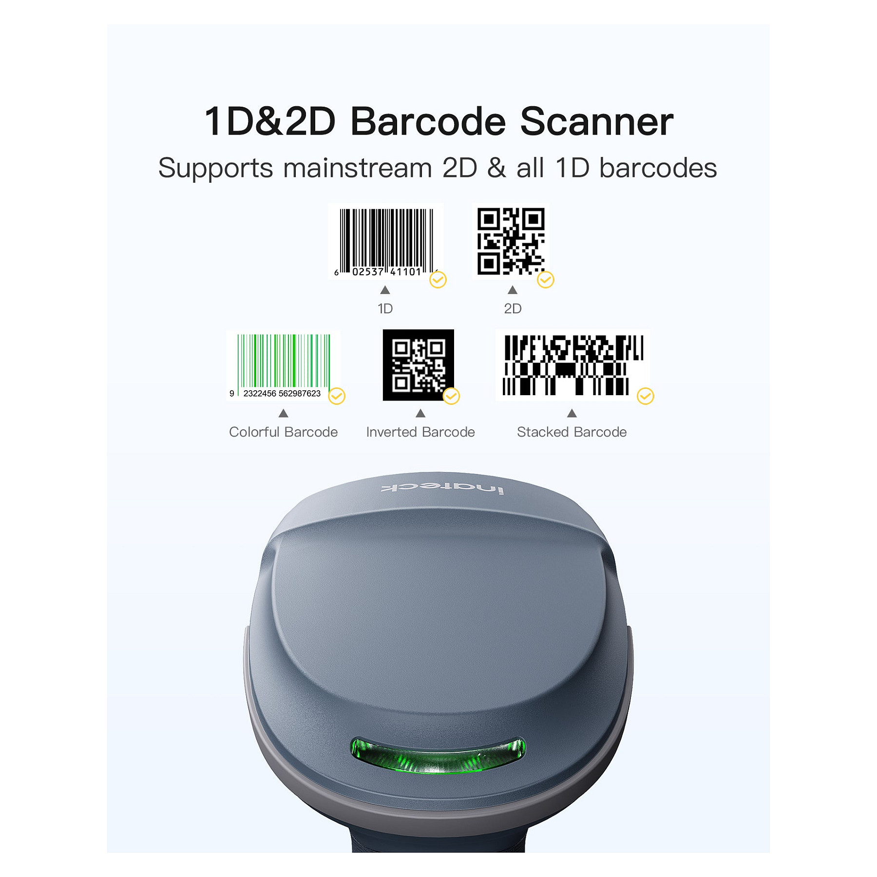 Inateck BCST-54. Typ: Tragbares Barcodelesegerät, Scanner-Typ: 1D/2D, Sensor-Typ: CMOS. Übertragungstechnik: Verkabelt & Kabellos, Standard-Schnittstellen: Bluetooth, USB. Produktfarbe: Blau, Grau, Gehäusematerial: Acrylnitril-Butadien-Styrol (ABS), Polycarbonat (PC), Thermoplastisches Urethan (TPU). Energiequelle: Akku, USB, Akku-/Batteriekapazität: 2600 mAh, Eingangsspannung: 5 V. Gewicht: 166 g, Breite: 90,9 mm, Tiefe: 68,3 mm