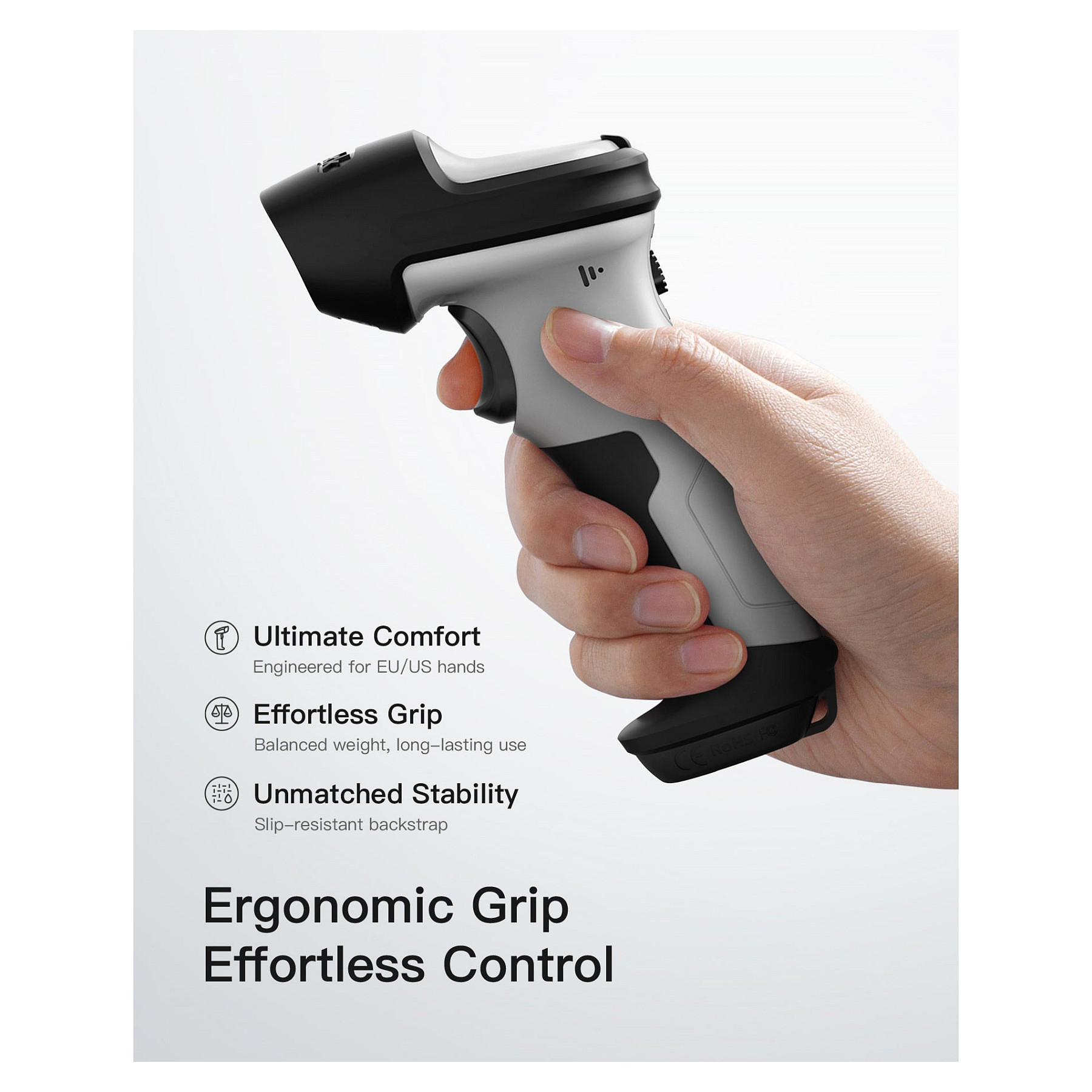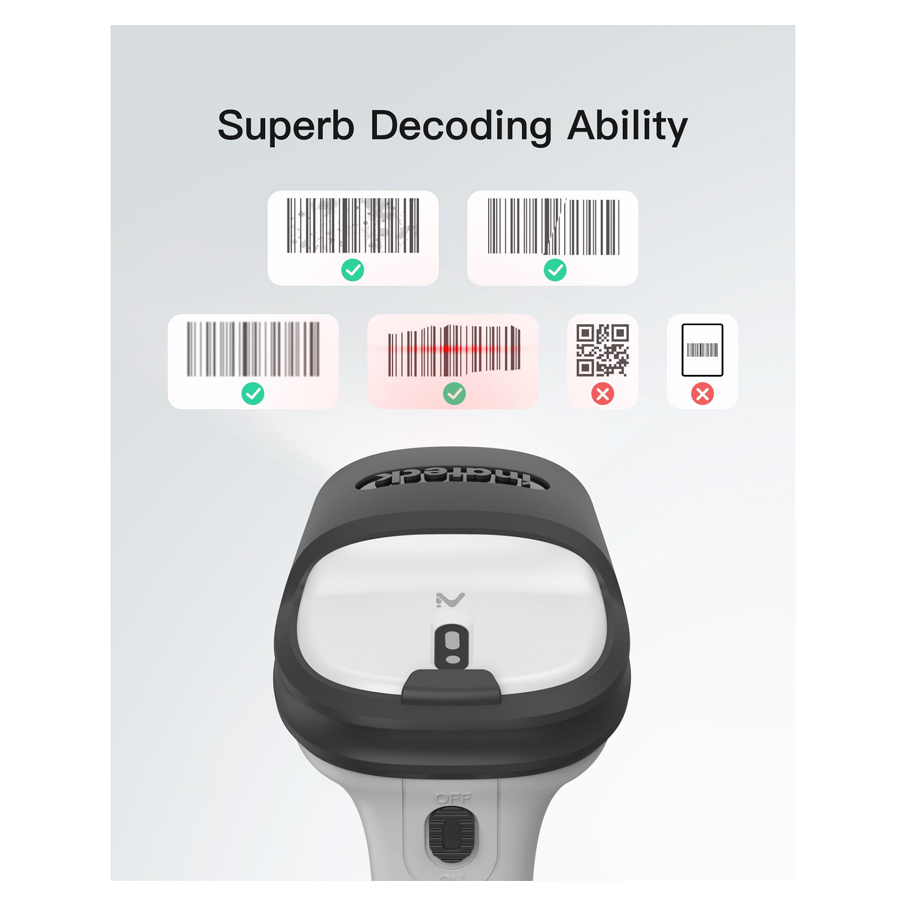 Inateck BCST-70-AI. Typ: Tragbares Barcodelesegerät, Scanner-Typ: 1D, Sensor-Typ: Laser. Übertragungstechnik: Kabellos, Standard-Schnittstellen: Bluetooth, USB. Produktfarbe: Schwarz, Grau, Gehäusematerial: Polycarbonat (PC), Thermoplastisches Urethan (TPU), Schutzfunktion: Stoßfest. Energiequelle: Akku, Akku-/Batteriekapazität: 2600 mAh. Gewicht: 200 g, Breite: 92 mm, Tiefe: 69 mm